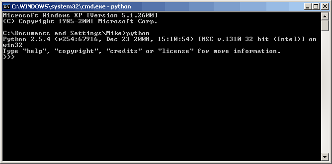 Now we’re going to make sure Python is set up right. Open a command window by going to Start –> Run and then typing “cmd†and pressing enter or return. Try typing “python†(without the quotes) in there and hitting your enter key. If you see the Python shell, then we’re halfway there. It should look something like this: